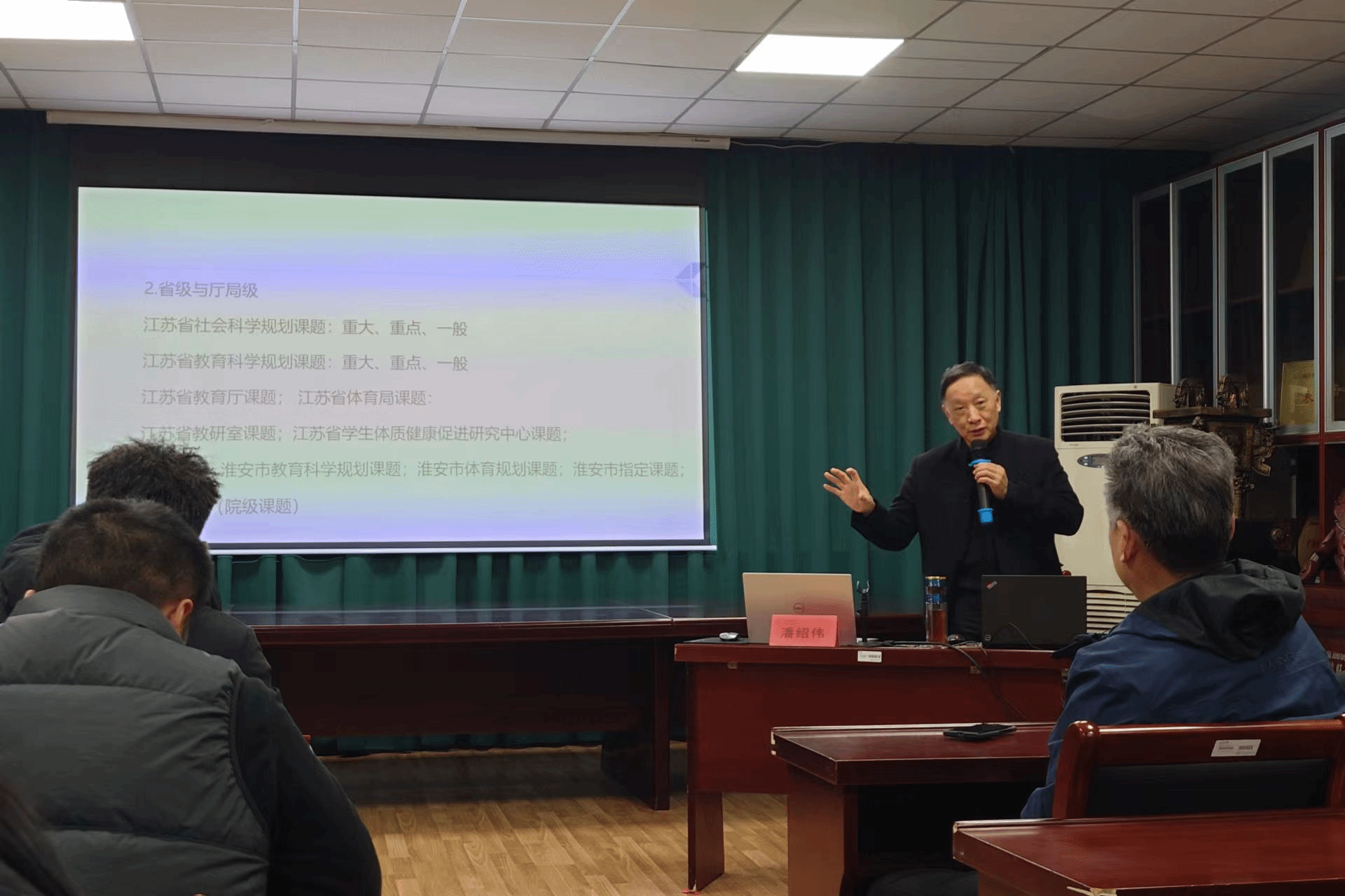 为进一步推进开云足球体育(中国)官方网站有组织科研,凝聚力量、打造队伍,2024年1月15日下午15.00,教育部全国高等学校体育教学指导委员会委员、中国体育科学学会学校体育专业委员会委员、扬州大学二级教授、扬州大学体育科学学院院长潘邵伟教授在我院大会议室举行《科学研究课题撰写与申报技巧》专题讲座。