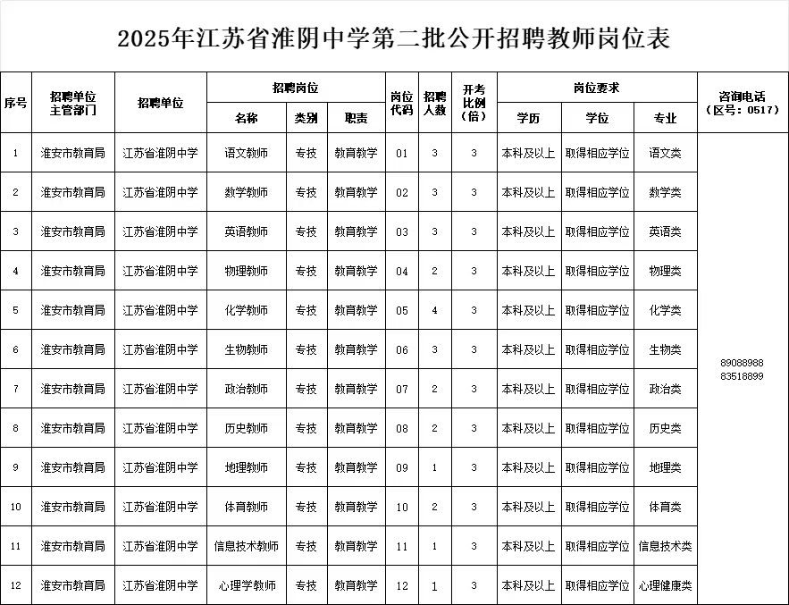 3月13日,江苏省淮阴中学发布《2025年江苏省淮阴中学第二批公开招聘教师公告》(详情可至淮安市人力资源和社会保障局网站、江苏省淮阴中学网站查看),面向社会公开招聘教师27名(事业编制)。本次招聘采用网上报名和现场报名两种方式进行。