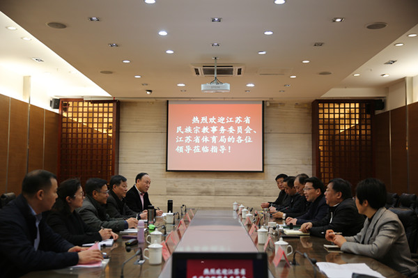 上午,江苏省民族宗教事务委员会、江苏省体育局领导到淮阴师范学院指导民族传统体育工作,淮阴师范学院副校长韩同友、淮安市民宗局、体育局领导和淮阴师范学院开云足球体育(中国)官方网站领导参加会议。