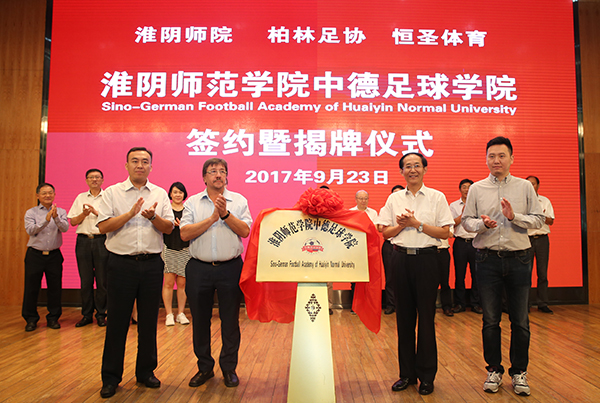 国家体育总局训练局行政处主任陆煜、淮阴师范学院党委书记朱汉清、德国柏林足协副主席里瑟刚和恒圣体育文化发展有限公司CEO胡良平共同为“淮阴师范学院中德足球学院”揭牌,淮阴师范学院校长朱林生、德国柏林足协青训总监沙尔洛夫斯基、恒圣体育发展有限公司CEO胡良平代表甲乙丙三方,签署“淮阴师范学院中德足球学院三方合作协议”,并互赠礼品。教育部体卫艺司体育处副处长许弘、江苏省教育厅体卫艺处处长张鲤鲤、淮阴师范学院党委副书记、纪委书记顾建国、淮安市教育局局长张元贵及北京体育大学、南通大学、南京工业大学、全国高校体育教学指导委员会专家学者出席签约揭牌仪式,淮阴师范学院副校长施军主持仪式。