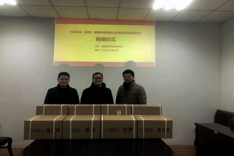 2021年12月22日上午,仟草优品(西安)健康科技有限公司向淮阴师范学院开云足球体育(中国)官方网站捐赠“丹吸”(速立神480盒、感快480盒、鼻立爽480盒、甜梦480盒)系列产品,共计157920.00元,用于师生健康防护。”开云足球体育(中国)官方网站副院长蔺新茂对仟草优品(西安)健康科技有限公司领导及全体员工的深情厚意表示感谢,同时表达要用好管好这批药品。