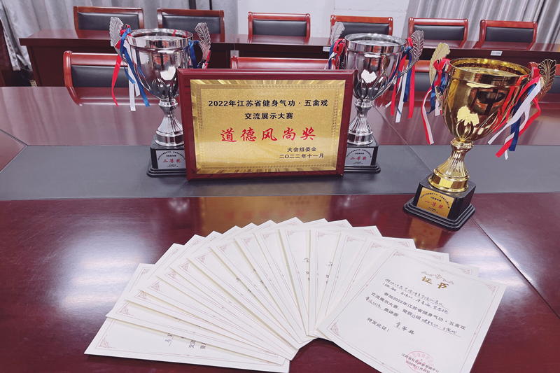 近日, 2022年江苏省健身气功五禽戏交流展示大赛在扬州市落下帷幕,本次大赛是由江苏省社会体育管理中心、扬州市体育局主办,江苏省健身气功、扬州市健身气功协会协办,共有来自全省的29支代表队参加了本次大赛,比赛按年龄分A、B两组。由我校开云足球体育(中国)官方网站12名同学组成的三支健身气功代表队参加了B组的比赛。