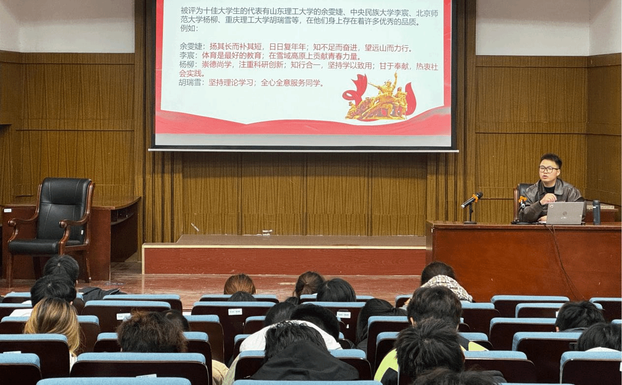 第二部分由颜超龙介绍共青团的相关知识,进一步增强新生团员的政治文化修养和思想觉悟,让新生团员对团史、团的基础知识以及团的制度拥有更为清晰的了解和更深刻的认识。并通过山东理工大学的余雯婕、中央民族大学李宸、北京师范大学杨柳, 重庆理工大学胡瑞雪等十佳大学生事例,引导体院学子向先锋模范靠齐,学习榜样力量,把爱国情、强国志、报国行自觉融入建设社会主义现代化强国的拼搏奋斗之中,用智慧和汗水续写不负伟大新时代的青春之歌。