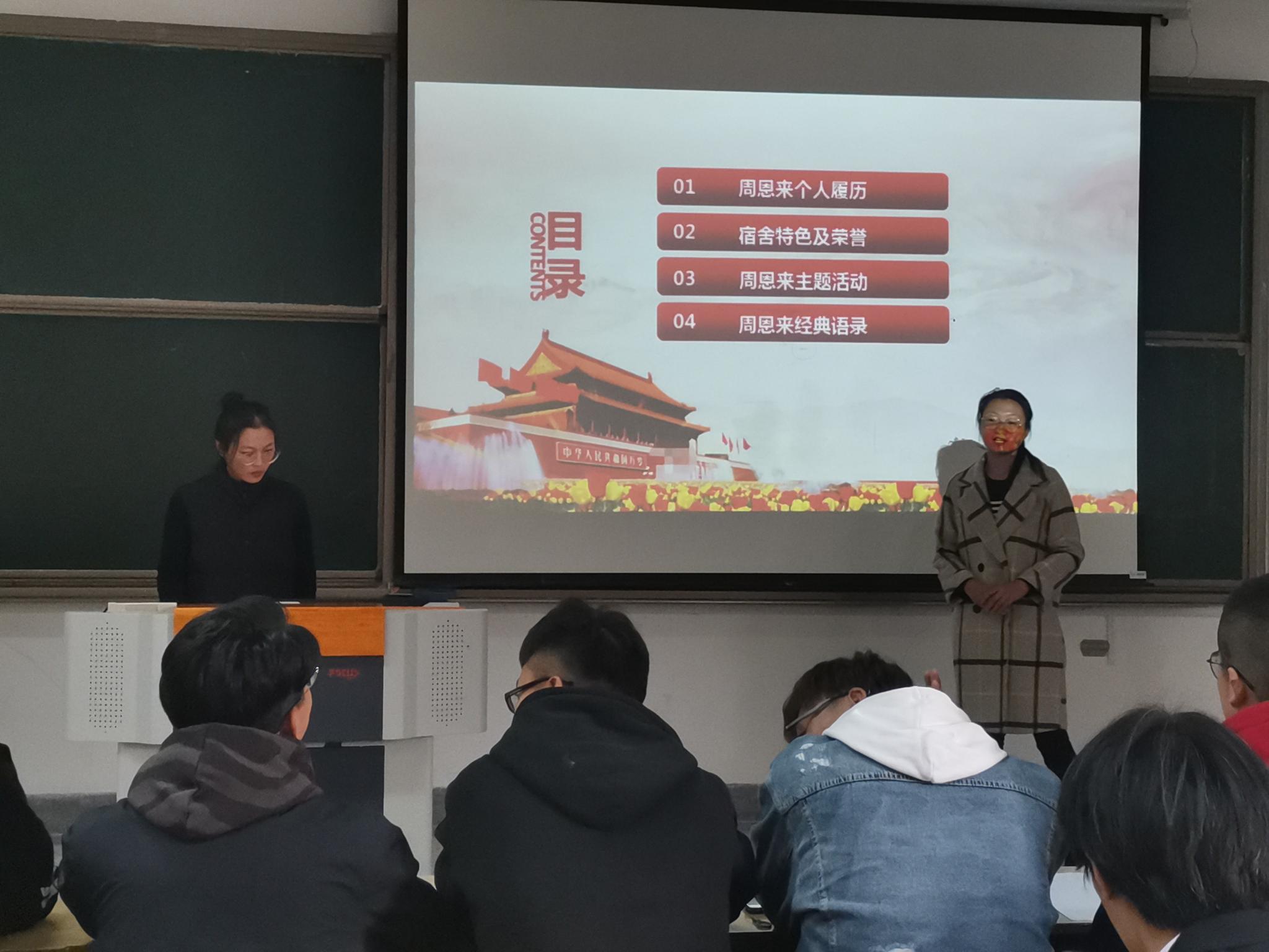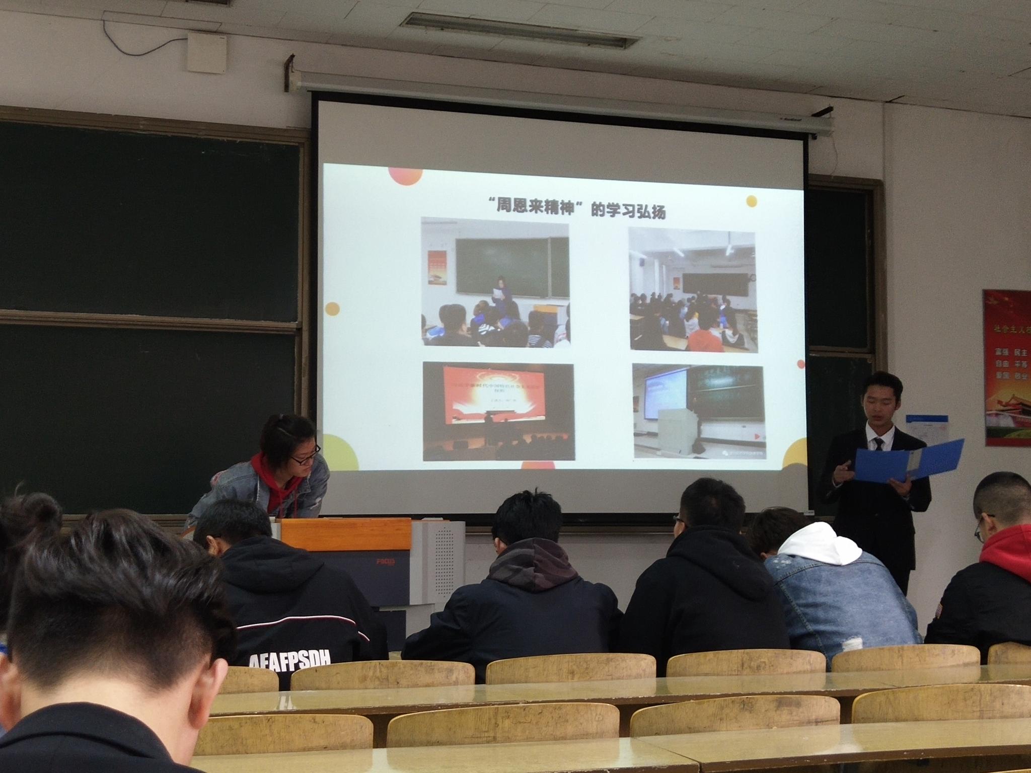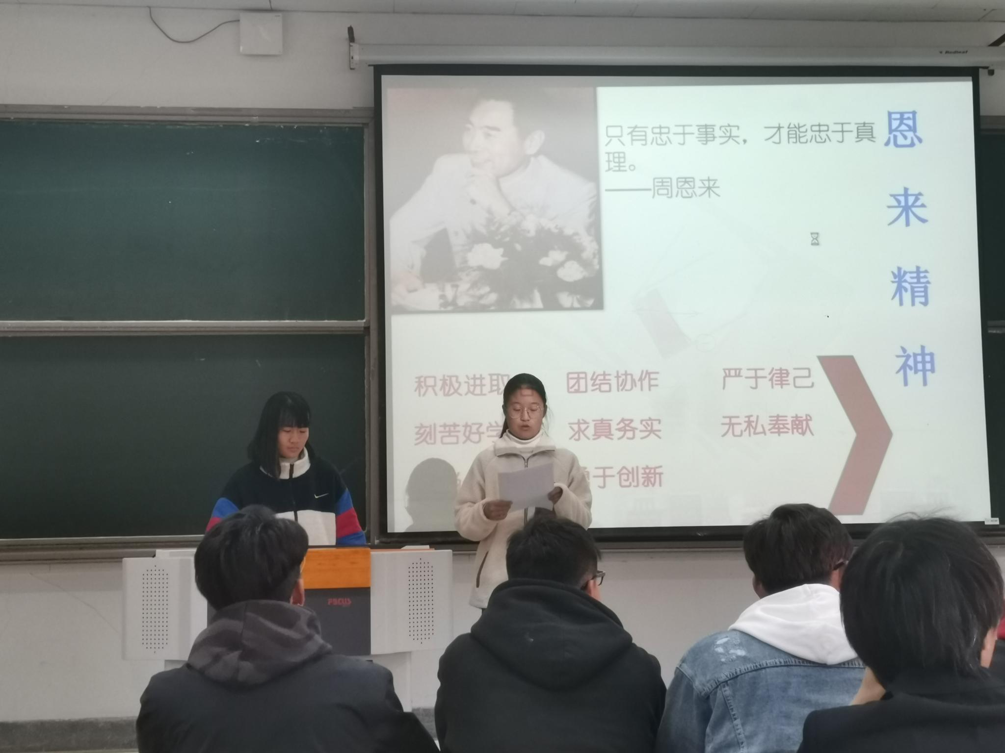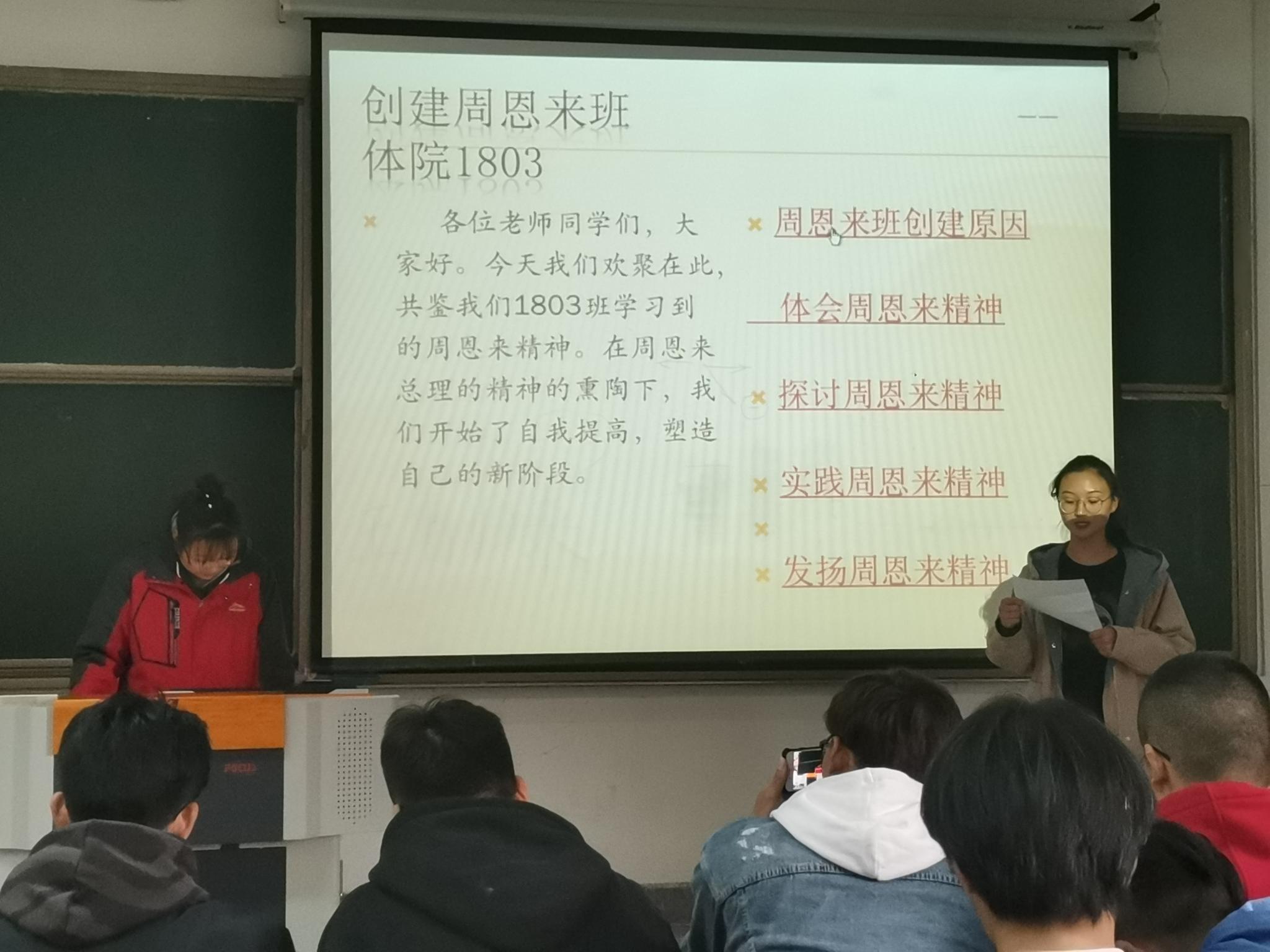 追求真理、崇尚理想、生命不息、奋斗不止、不断进取、酷爱学习、善于学习、学以致用、胸襟博大、广交朋友、善于协作、理想远大、淡泊名利、一心为公、鞠躬尽瘁、死而后已等是周恩来精神的集中写照。作为大学学生我们应该把学习周恩来精神,创建周恩来班贯穿于班级全体同学思想品德教育的始终,让周恩来精神在全体学生心中生根。通过“周恩来班”的创建,全体学生学习习惯和生活习惯都得到了加强。很多学生由刚进大学时的懵懂无知转变为一个具有良好行为习惯的优秀学生。让每个学生形成以遵守纪律、养成良好习惯为荣,不学无术为耻的观念。