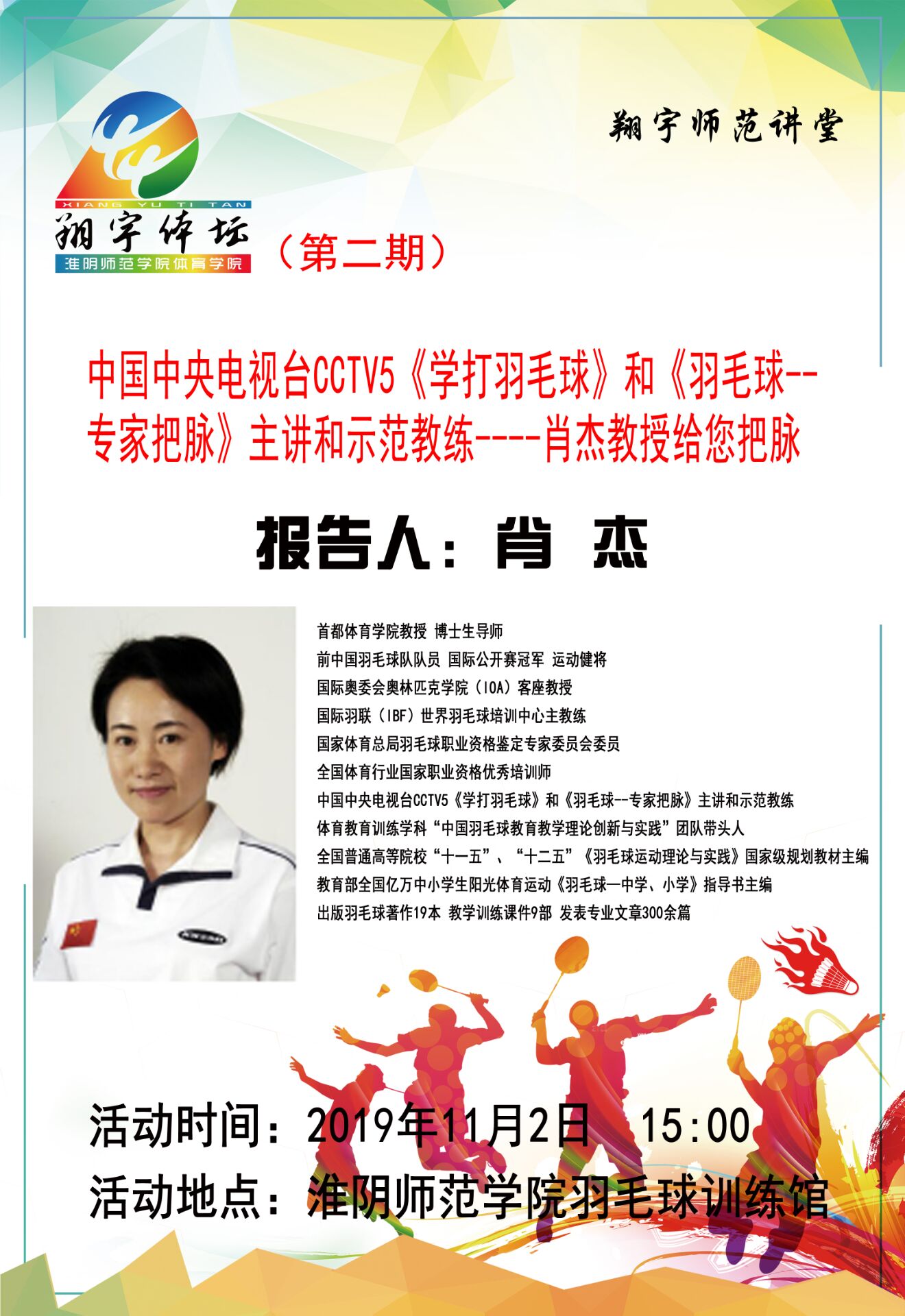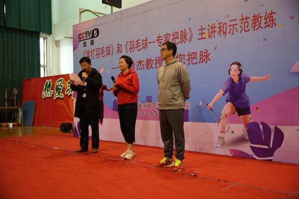 体院新闻网11月2日电(记者 沈璐)11月2日下午3点,在淮阴师范学院羽毛球训练馆举行了“中共中央电视台CCTV5《学打羽毛球》和《羽毛球专家把脉》主讲和师范教练——肖杰教授给您把脉”活动。这是开云足球体育(中国)官方网站“翔宇体坛”和翔宇师范讲堂的第二期活动,参加此次活动的有淮阴师范学院、淮阴工学院部分羽毛球专项教师及两校羽毛球校队学生和开云足球体育(中国)官方网站部分师范生。体院副院长周卫东主持了本次活动,并对肖杰教授的到来表示热烈欢迎和衷心感谢。