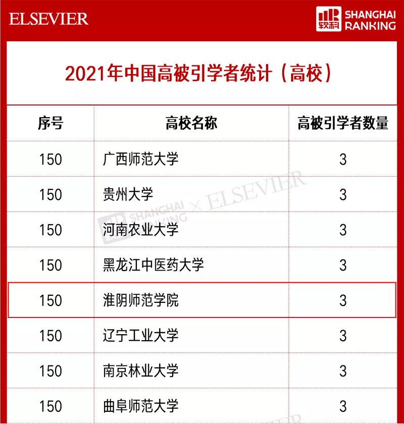 日前,全球性信息分析公司爱思唯尔(Elsevier)正式发布了2021“中国高被引学者”(Highly Cited Chinese Researchers)榜单。淮阴师范学院王玮明教授、洪法水教授、刘蒙教授分别入选计算机科学与技术、生物学以及数学学科领域榜单。淮阴师范学院排名位居中国内地高校第150位。